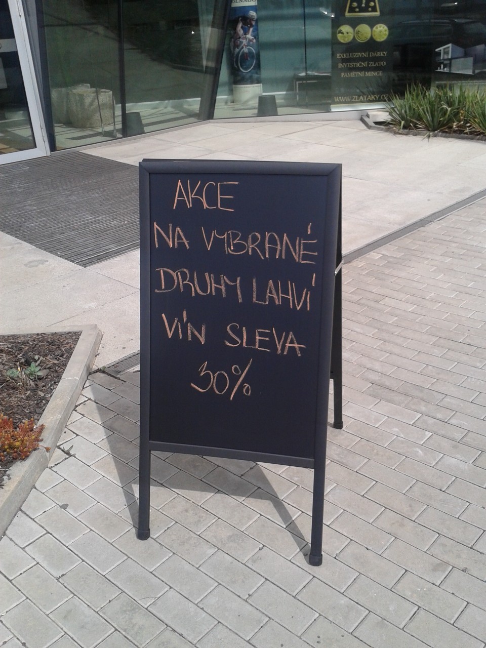 Takže máme třeba kulaté toskánské za dvě stovky, či dle zvyklostí u nás za 199 Kč. Z toho sklo devět korun. třetina dolů a láhev rázem stojí šest. Takže zákazníku, div se: po 30procentní slevě se dostaneš ze 199 na 196 korun. No neber to!